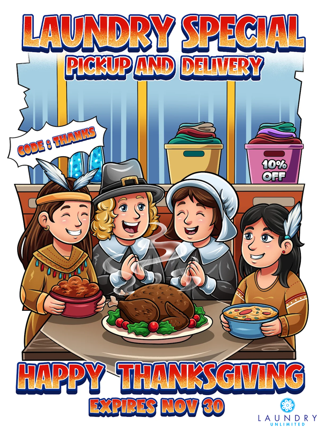 Thanksgiving is here and we’re celebrating with a special deal for you. Enjoy 10 percent off Laundry Pickup and Delivery so you can focus on family, food, and relaxation while we take care of the laundry.